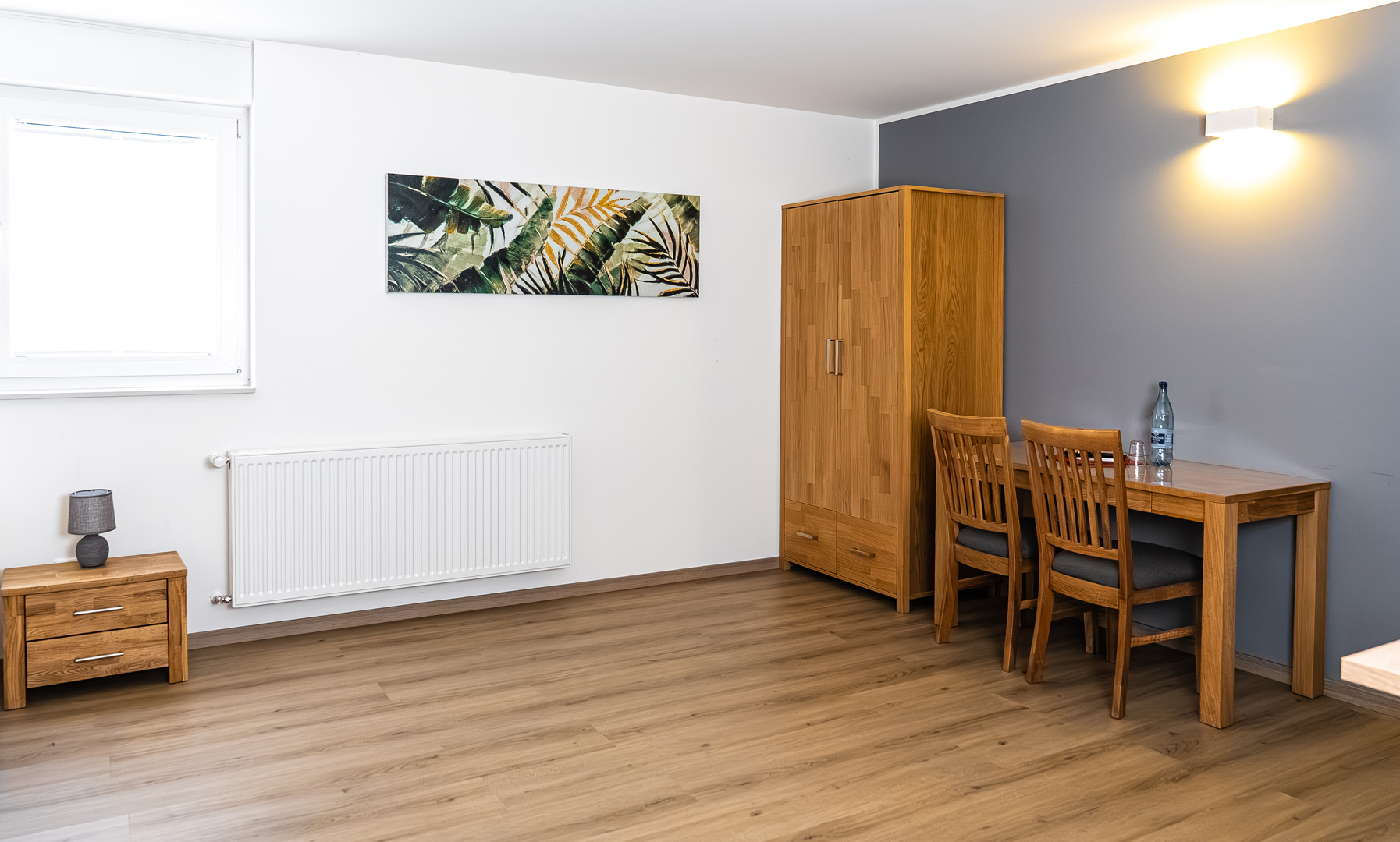 Mit durchdachter Einrichtung, großzügigen Platzverhältnissen und leichter Erreichbarkeit sind unsere barrierefreien Zimmer die ideale Wahl für alle, die Wert auf einen so selbstbestimmten wie entspannten Aufenthalt legen. Die Ausstattung bietet Ihnen alles, was Sie für eine angenehme Zeit in Paderborn benötigen: von hochwertigen Massivholzmöbeln über eine vollausgestattete Küche bis hin zu modernen Bädern mit nahezu ebenerdiger Glasdusche. Durch die breiten Eingangstüren, den stufenlosen Zugang und die offene Raumgestaltung sind alle Bereiche bequem nutzbar – auch für Rollstuhlfahrer.